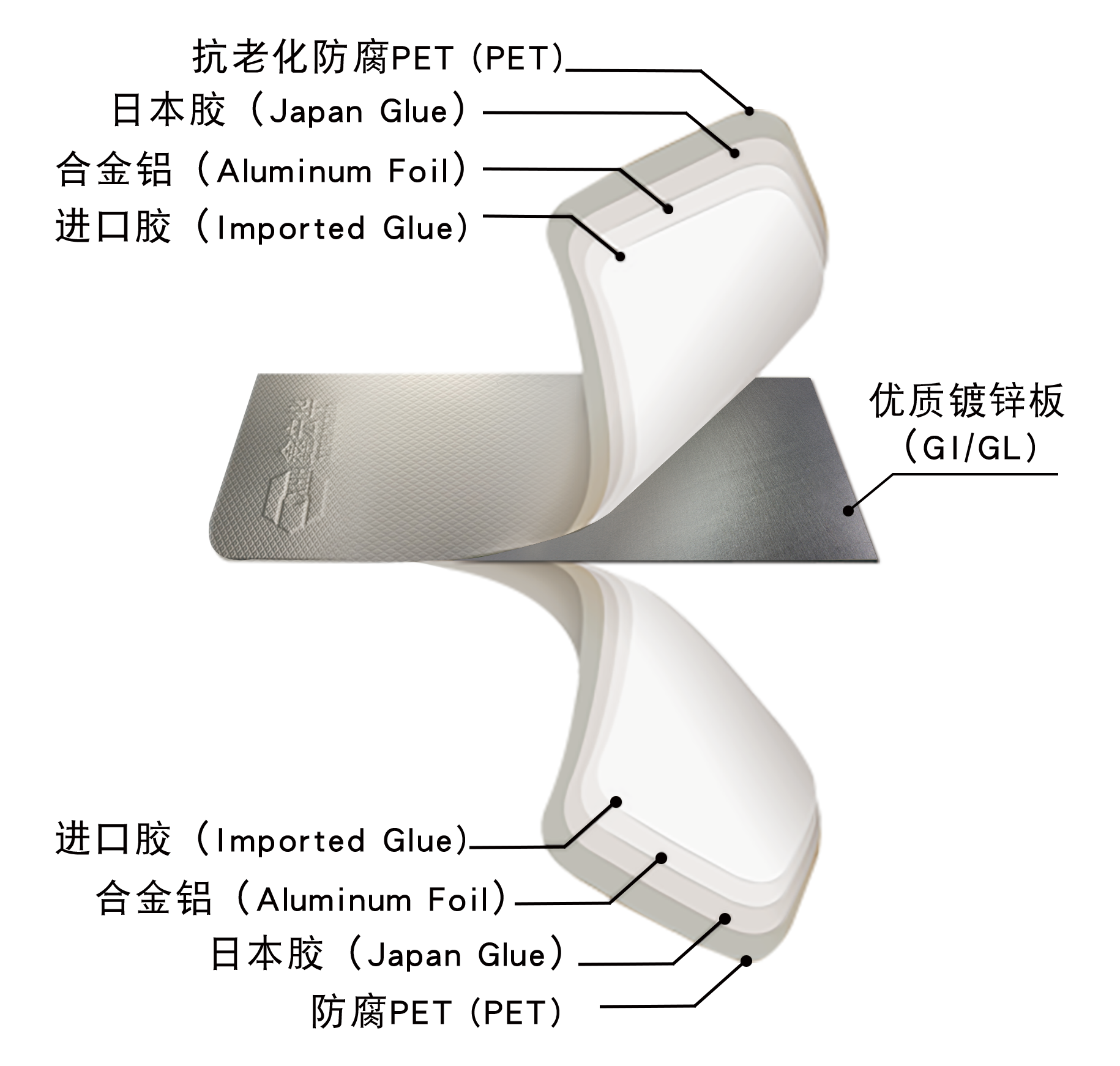 3.寿命久远:多层耐腐材料构成阶梯式防护结构。当最外层的抗老化膜出色地履行其使命后,内层材料接力防护。这使产品的耐久性不再依赖于单一材料,而是源于稳定可靠的层层守护机制,确保在任何阶段,基板都处于核心守护,从而延长板材的整体使用寿命。