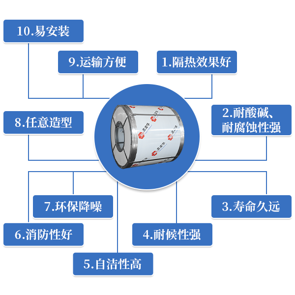 1.隔热效果好:镜面铝箔反射85%的阳光,降低板面温度,使板材不易积累热量,起到良好的隔热效果,隔热实验中实测板面温度比彩涂板低15-25℃,实际钢构厂房室内温度比彩涂板低2-4℃。