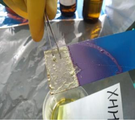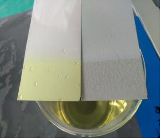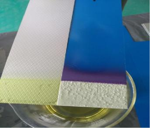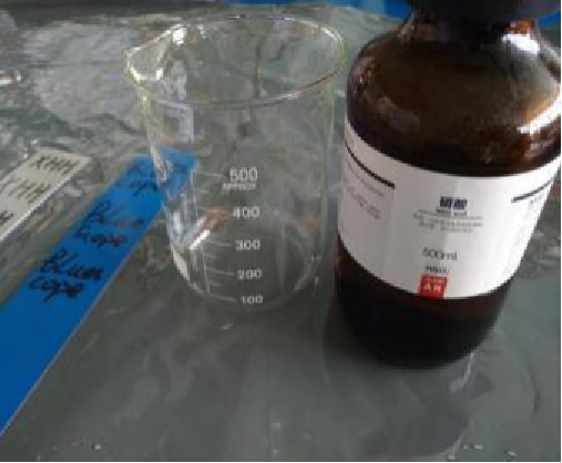 1.将两个样品面板放入浓硝酸溶液中,记录两个样品在不同时间段的外观变化。几秒钟后,某品牌板的顶部油漆出现了许多气泡并开始褪色,靠近液体的暴露在空气中的部分也出现了明显的褪色。相比之下,鑫宏华复合板材的表面无明显变化。
