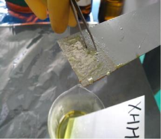 2.6分钟,某品牌板的顶漆已基本溶解,只留下覆盖在表面的腐蚀性残留物,板面有一定程度的损坏。